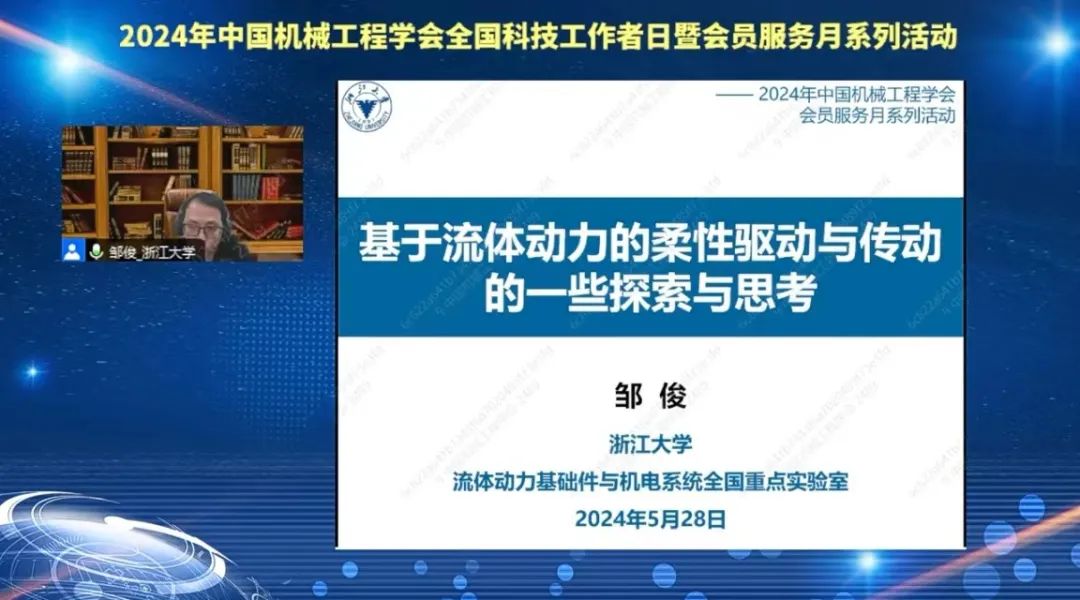5月28日,在2024年188金宝搏网址 全国科技工作日暨会员服务月活动期间,浙江大学邹俊教授线上分享了题为“基于流体动力的柔性驱动与传动的探索与思考”报告。报告由188金宝搏网址 成组与智能集成技术分会副总干事、工业与大数据与智能系统分会委员、浙江大学机械工程学院院长助理王柏村研究员主持。